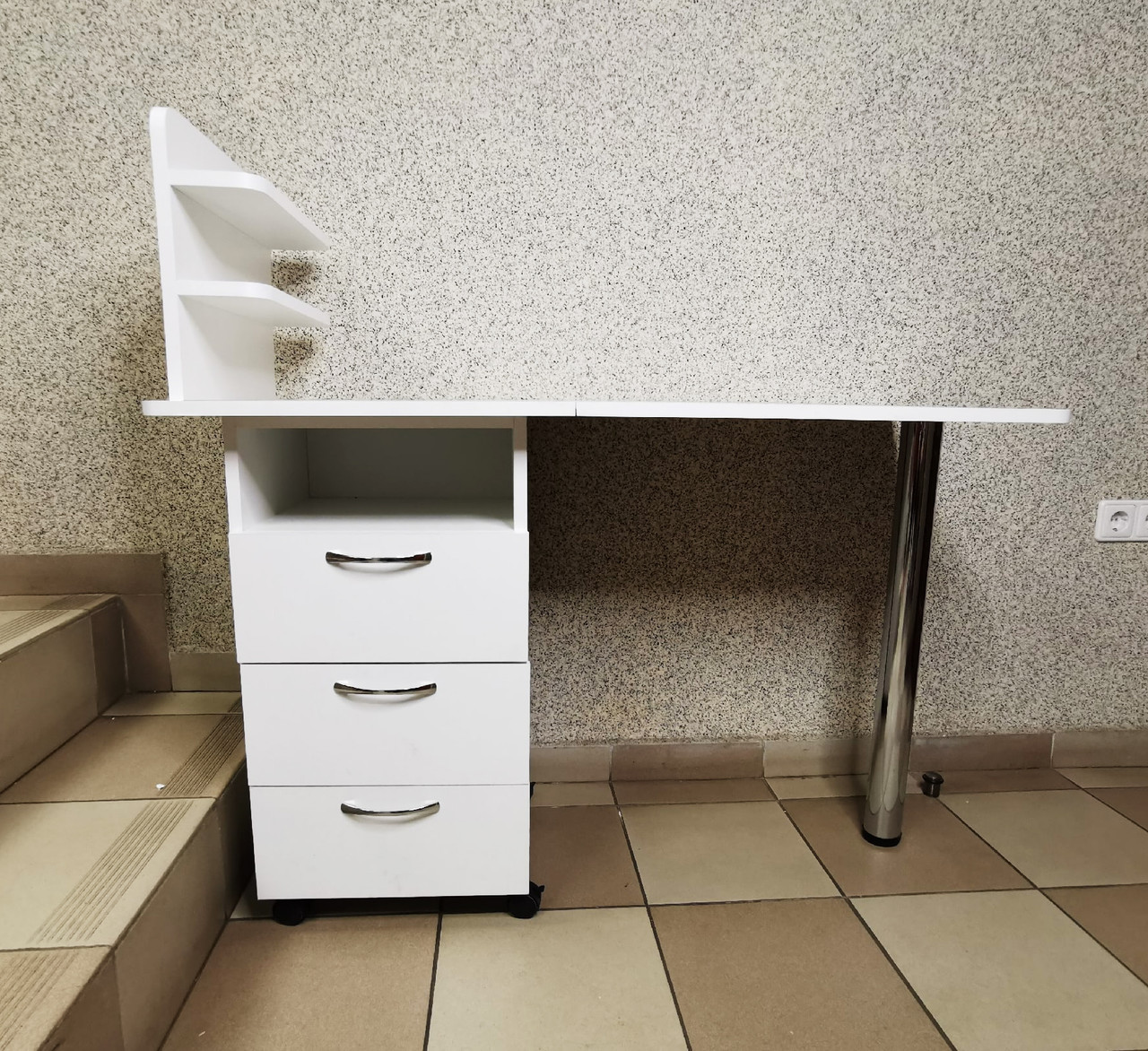 Стол для маникюра разработан с учетом пожеланий профессионалов маникюрного дела. Идеально подойдет для салона красоты и парикмахерской. Стол имеет тумбу, где 3 полочки выдвижных. Так же к стол имеет очень удобные полочки для лаков. Монтаж полочек может осуществляться как с правой, так и с левой стороны.Внизу подшибники . Тумба может располагаться, как слева, так и справа.